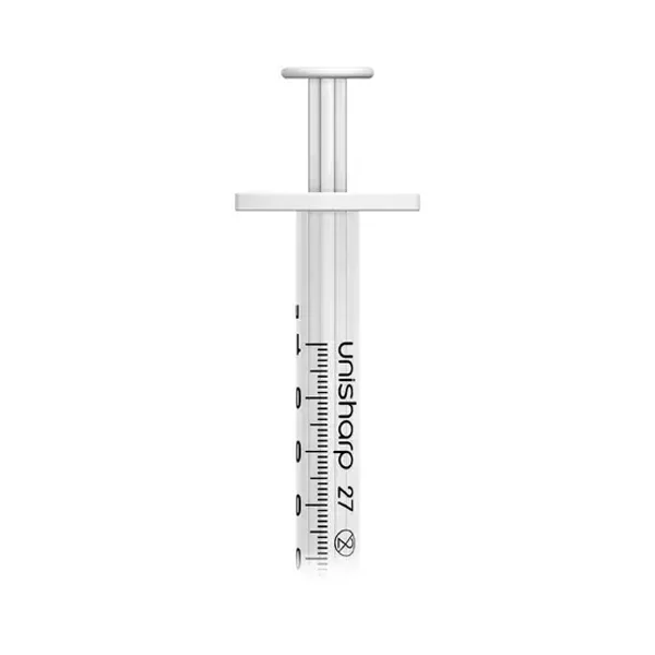 These high quality fixed needle syringes from Unisharp have a capacity of 1ml. They feature a matching white plunger and needle cap for easy identification.
