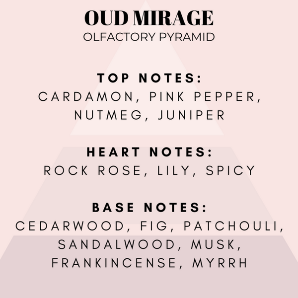 Oud Mirage blends Dubai’s iconic Middle Eastern fragrance profile with modern luxury. Cardamom, pink pepper, nutmeg and juniper ignite the senses, followed by rock rose, lily and warm spice. The base is rich and complex with cedarwood, fig, patchouli, sandalwood, musk, frankincense and myrrh. A deeply exotic, long-lasting scent with undeniable Dubai allure.
